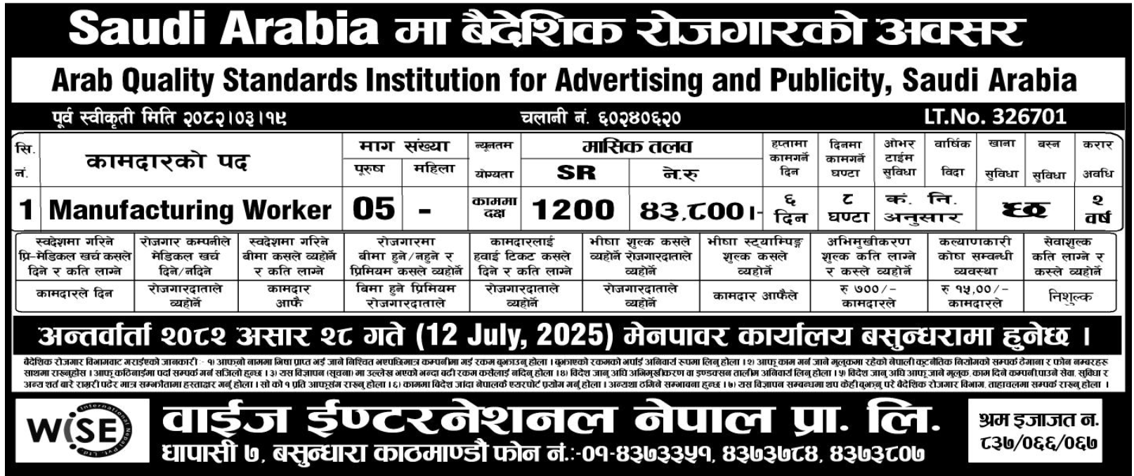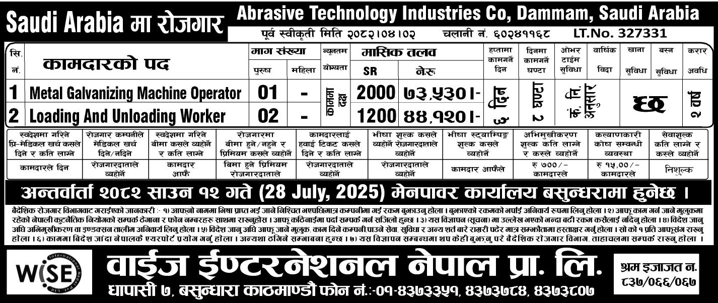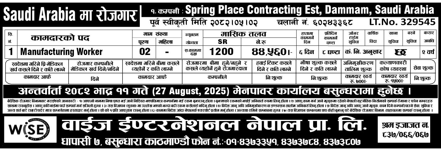 General Worker / Factory Worker 2 (2|0) 1200 Yes Yes As per company policy